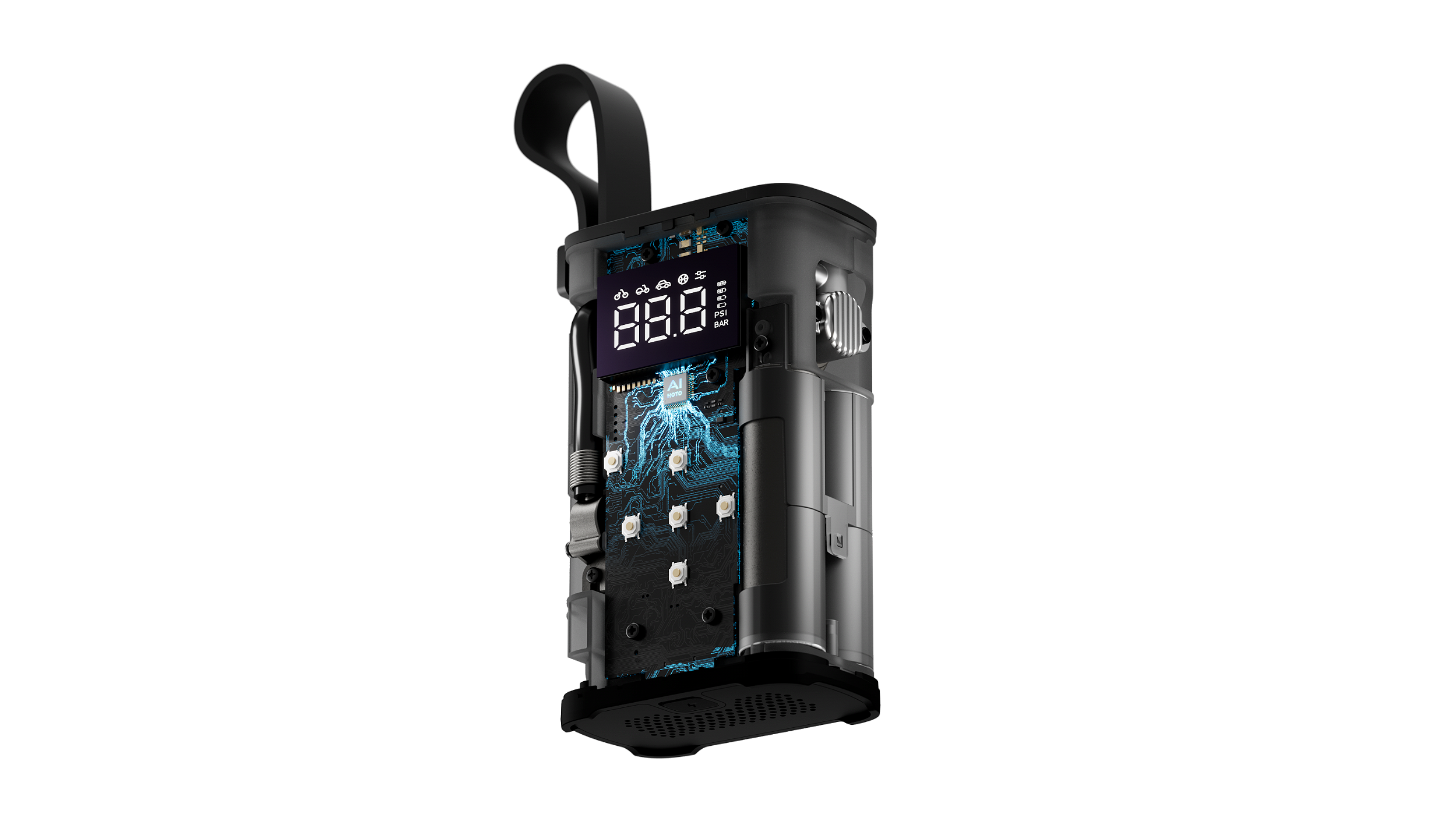 Equipada com display digital de alta precisão (±1 PSI), modos inteligentes pré-programados e lanterna LED com sinal SOS, a HOTO Air Pump vai muito além de uma bomba comum — é um acessório essencial para mobilidade e segurança.