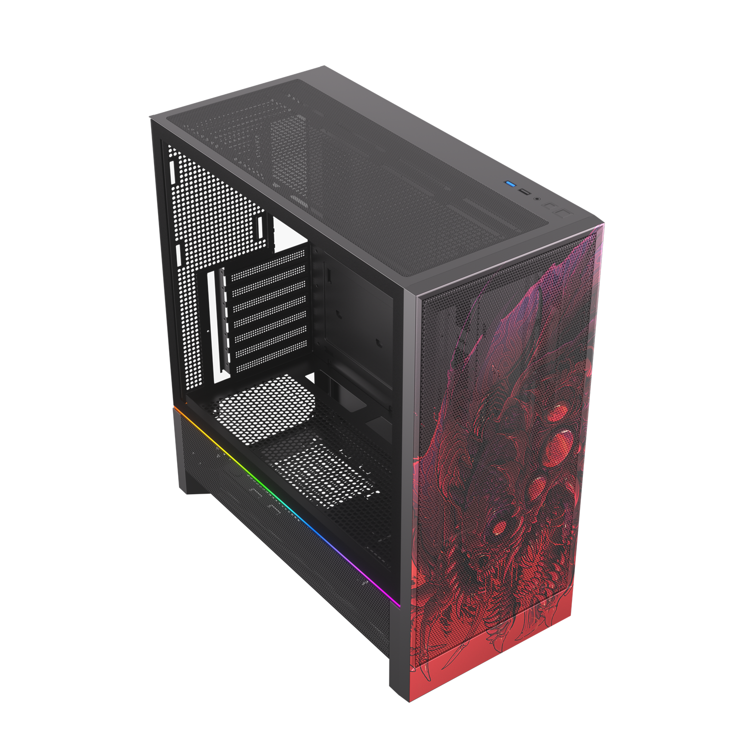 Seu projeto foi desenvolvido com foco em fluxo de ar eficiente, contando com painéis perfurados e suporte para uma grande quantidade de ventoinhas, garantindo excelente circulação interna para manter o sistema sempre refrigerado. Além disso, a janela lateral em vidro temperado permite exibir os componentes com elegância, enquanto a fita de LED RGB integrada no PSU cover adiciona ainda mais destaque ao setup.